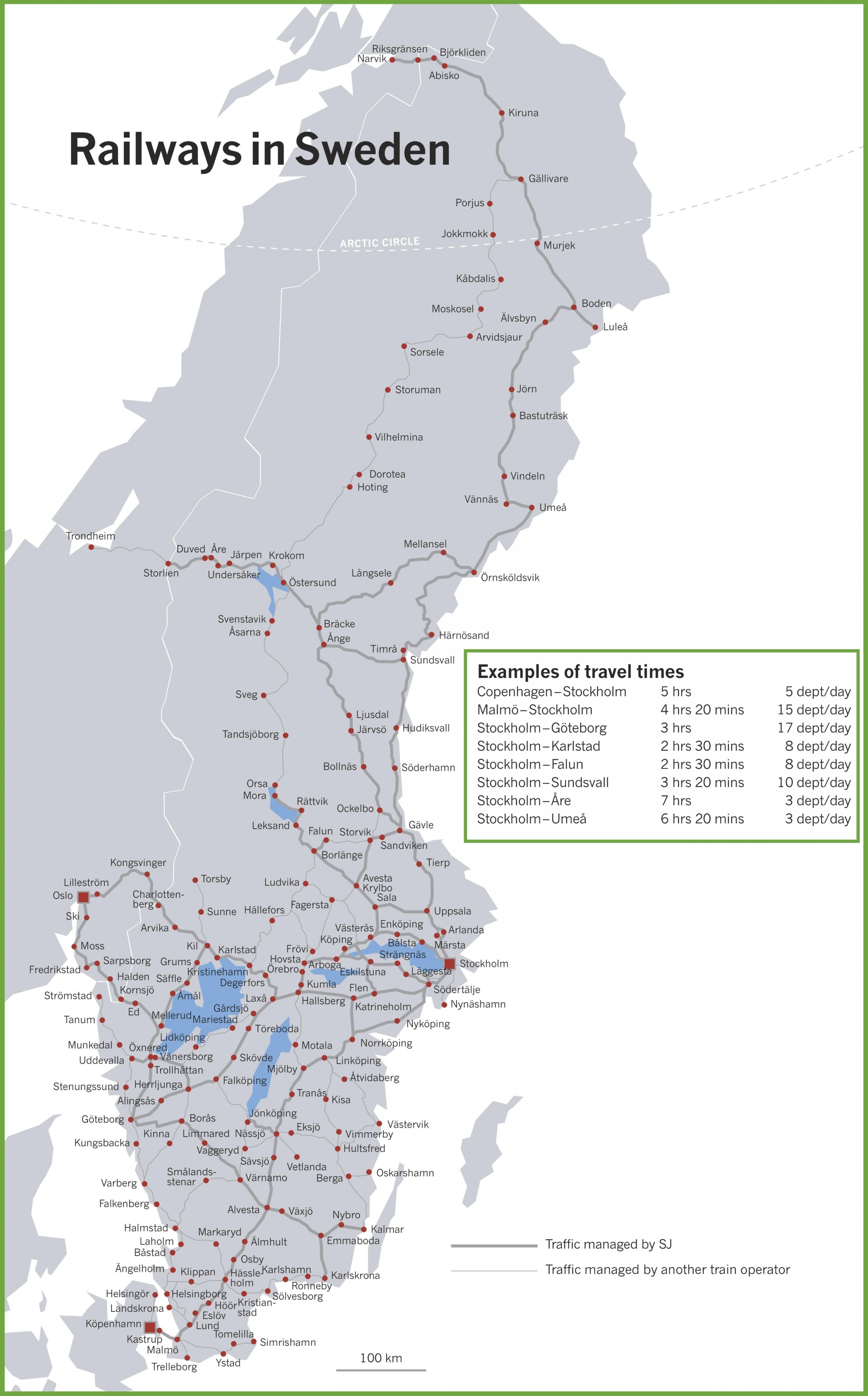 Train map Sweden. Sweden train map (Northern Europe - Europe) to print. Sweden train map (Northern Europe - Europe) to download. The main rail transport hubs in Sweden are in capital city Stockholm, west coast Gothenburg and Malmö in the south as its shown in Sweden train map. There are daily X2 high-speed services between all three and a high-speed train service between Stockholm and Stockholm-Arlanda Airport. So as soon as you step off the plane you could be embarking on a fabulous rail journey around Sweden. The X 2000 high-speed tilting train travels at up to 200 km/hour (125 mph) on all major routes and offers the highest standards of comfort, with radio and music channel outlets with all seats. In full-fare business class you will be served a meal at your seat, and in second class you have access to a bistro car, where hot and cold meals are available.