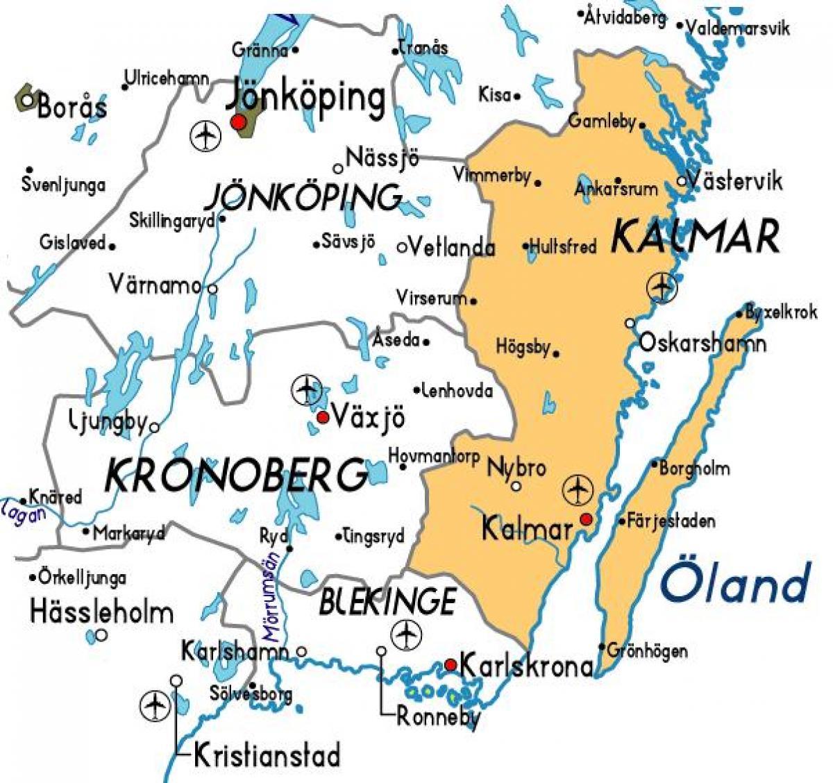 Kalmar Sweden map. Kalmar map Sweden (Northern Europe - Europe) to print. Kalmar map Sweden (Northern Europe - Europe) to download. Kalmar County (Kalmar län) is a county or län in southern Sweden. It borders the counties of Kronoberg, Jönköping, Blekinge and Östergötland. To the east in the Baltic Sea is the island Gotland as its shown in Kalmar map Sweden. The counties are mainly administrative units. Geographically Kalmar County covers the eastern part in the Småland province, and the entire island of Öland. Kalmar County was integrated with Kronoberg County until 1672. Blekinge was a part of Kalmar County between 1680 and 1683, due to the foundation of the naval base at Karlskrona.The County of Kalmar was formally granted its arms in 1944. Before this the county carried the arms of Småland and Öland side by side. The current arms is a combination of the arms for Småland and Öland. Blazon: "Quartered, the arms of Småland and Öland"