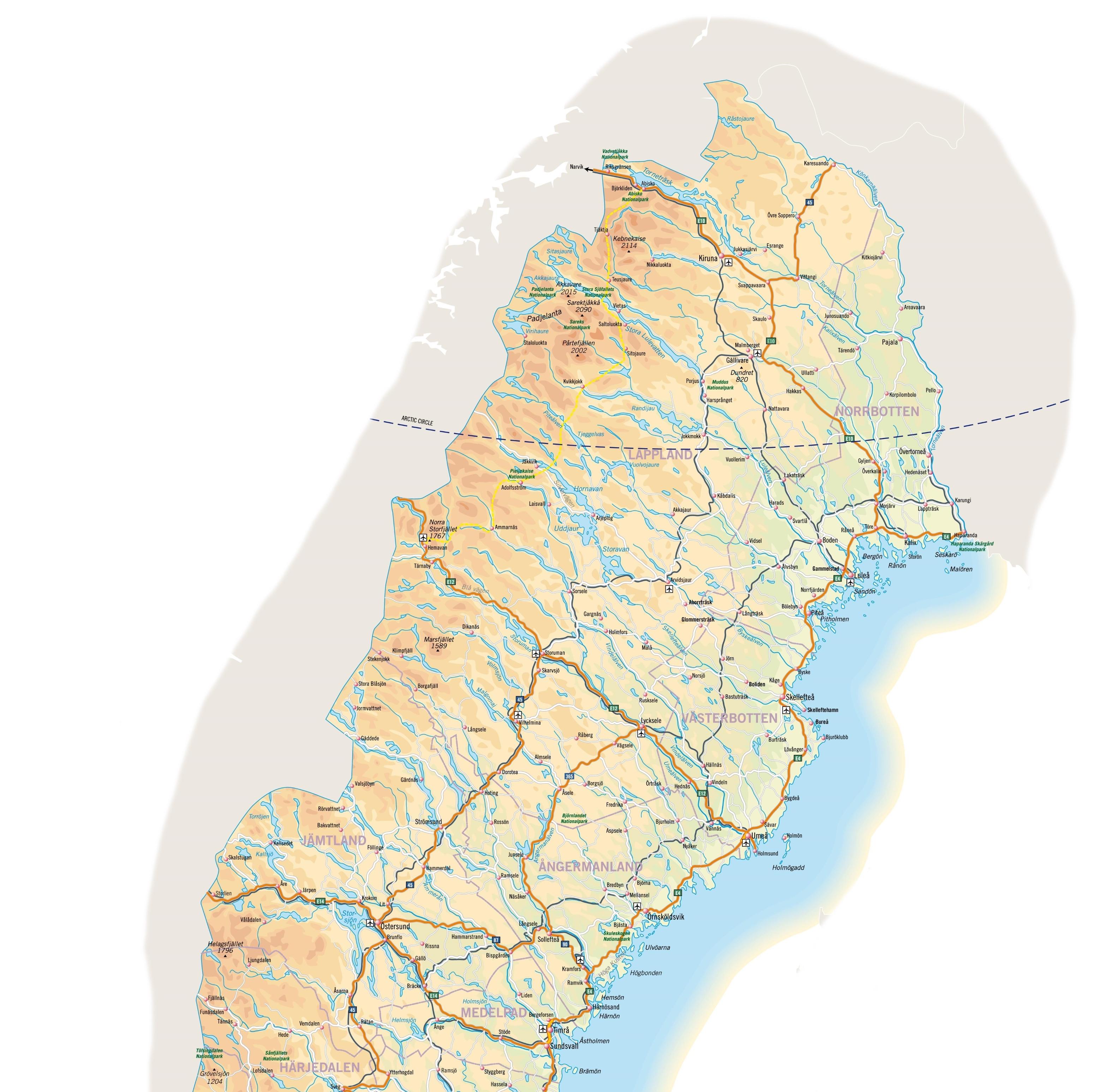Map of north Sweden. North Sweden map (Northern Europe - Europe) to print. North Sweden map (Northern Europe - Europe) to download. North Sweden and Swedish Lapland are unique as its shown in north Sweden map. There is nowhere else in the world where you can sit around the campfire with a Sami guide, sharing stories of the day’s dog sledding adventure. Stay at the world-famous ICEHOTEL or Treehotel for a really special experience. he most outstanding feature about northern Sweden is its climate. The northern summers are not as warm as in the southern parts of Sweden. The summers and winters in northern Sweden redefine that habit. In Lycksele, there is the Lycksele Zoo, with a great range of animals found in the north. There is also a nice camping site and water park at Ansia. One of the biggest attractions is Engine Week (Motorveckan).