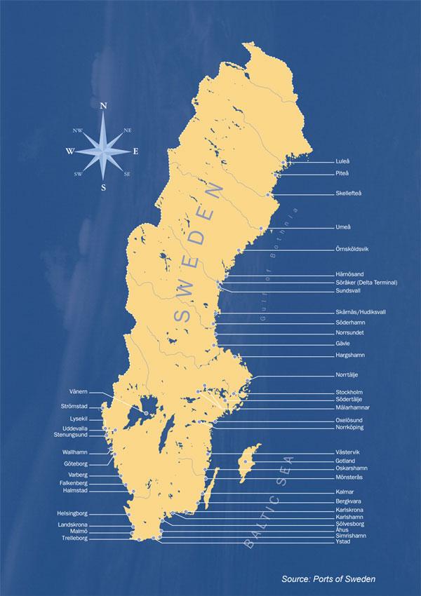Map of Sweden ports. Sweden ports map (Northern Europe - Europe) to print. Sweden ports map (Northern Europe - Europe) to download. Göteborg, Stockholm, and Malmö, the three largest ports, and a number of smaller ports are well-equipped to handle large oceangoing vessels. In 2005, the Swedish merchant fleet consisted of 205 ships of 1,000 GRT or more, with a combined capacity of 2,702,763 GRT. Canals in central Sweden have opened the lakes to seagoing craft; inland waterways add up to 2,052 km (1,275 mi), navigable by small steamers and barges. In 2018, Gothenburg was the Swedish port, which handled the largest volume of goods as its shown in Sweden ports map. In detail, more than 40.6 million metric tons of goods entered the port that year. The second busiest port was Trelleborg with over 11 million metric tons of goods handled.